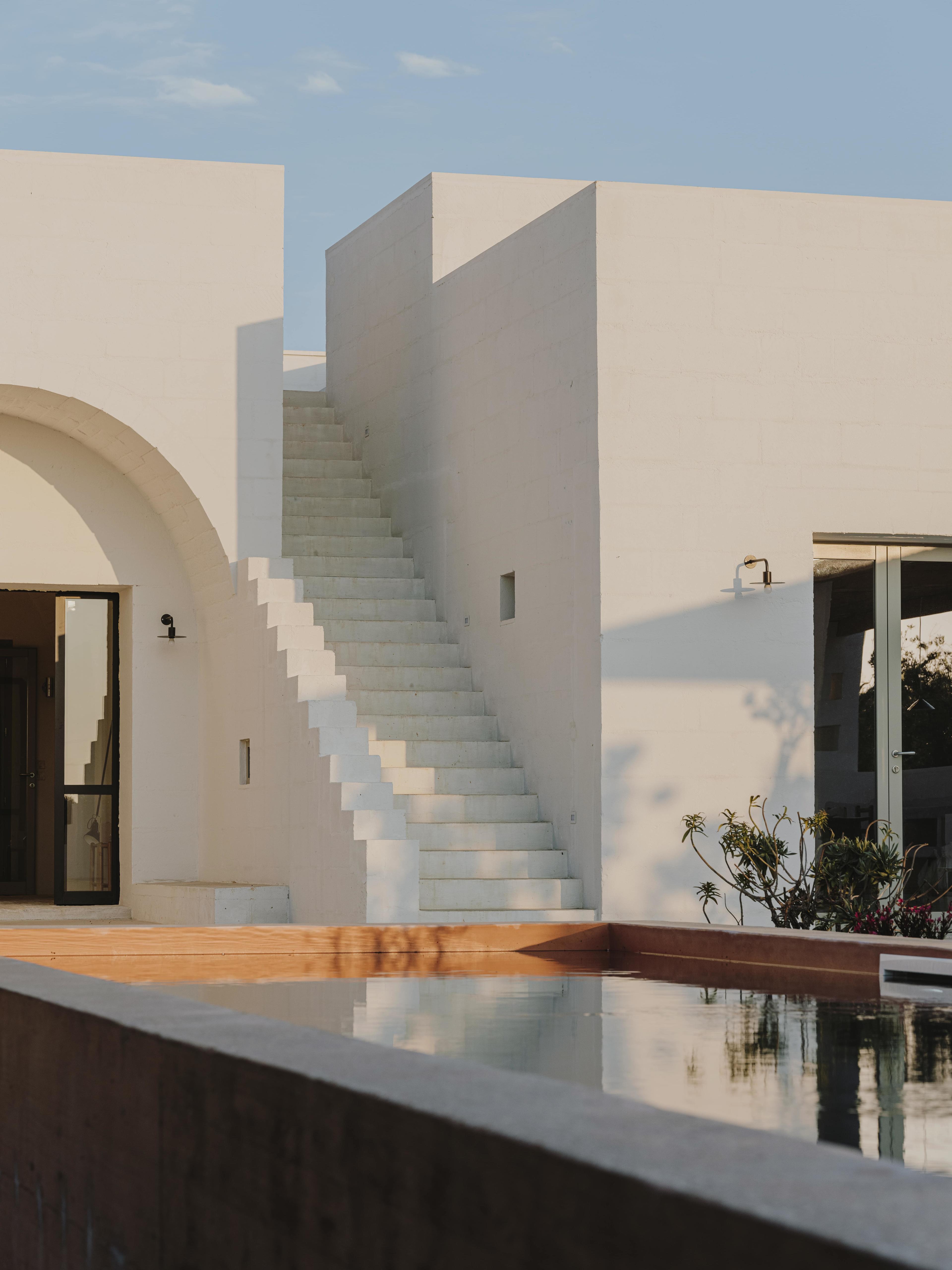 Andrew Trotter’s design philosophy centres on tradition, locality, and craftsmanship — values evident throughout Villa Cardo. The building thoughtfully integrates with its surroundings, showcasing the timeless elegance of Puglia’s historic architecture. The thick white stone walls, narrow shuttered windows, and limestone floors celebrate traditional building methods and locally sourced materials. These elements ensure the villa is light-filled and serene, ideally suited to the Mediterranean climate.