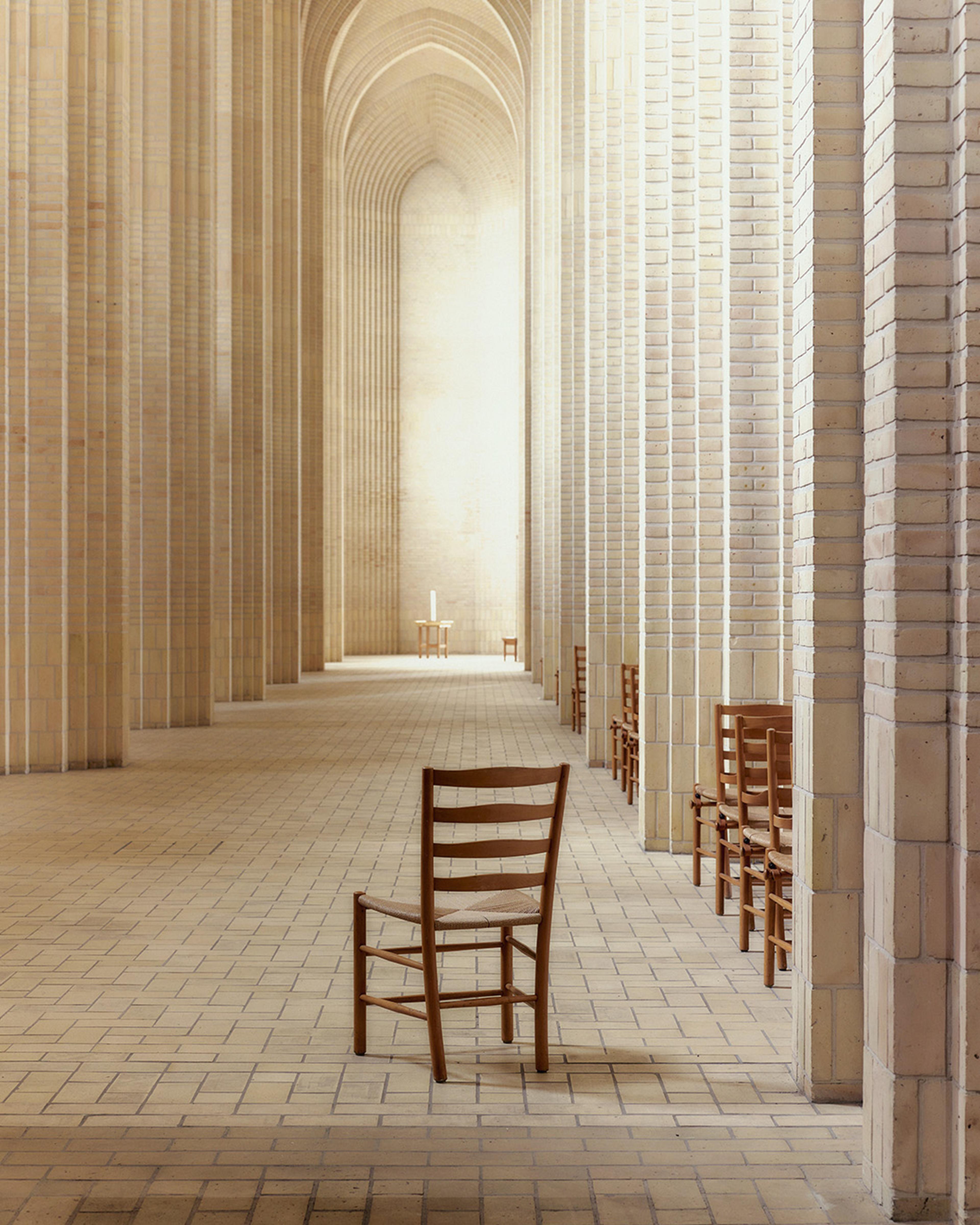 In addition to his revolutionary design approach and the creation of several significant pieces of furniture, Klint also made his mark on several Danish cultural institutions, including Designmuseum Danmark. Here, he transformed the interior of an erstwhile royal hospital in rococo style into a sleek and stylish setting for Danish design history. Klint was also a key figure in the creation of Grundtvigskirken (Grundtvig’s Church) in Copenhagen, which he accomplished together with his father and son.