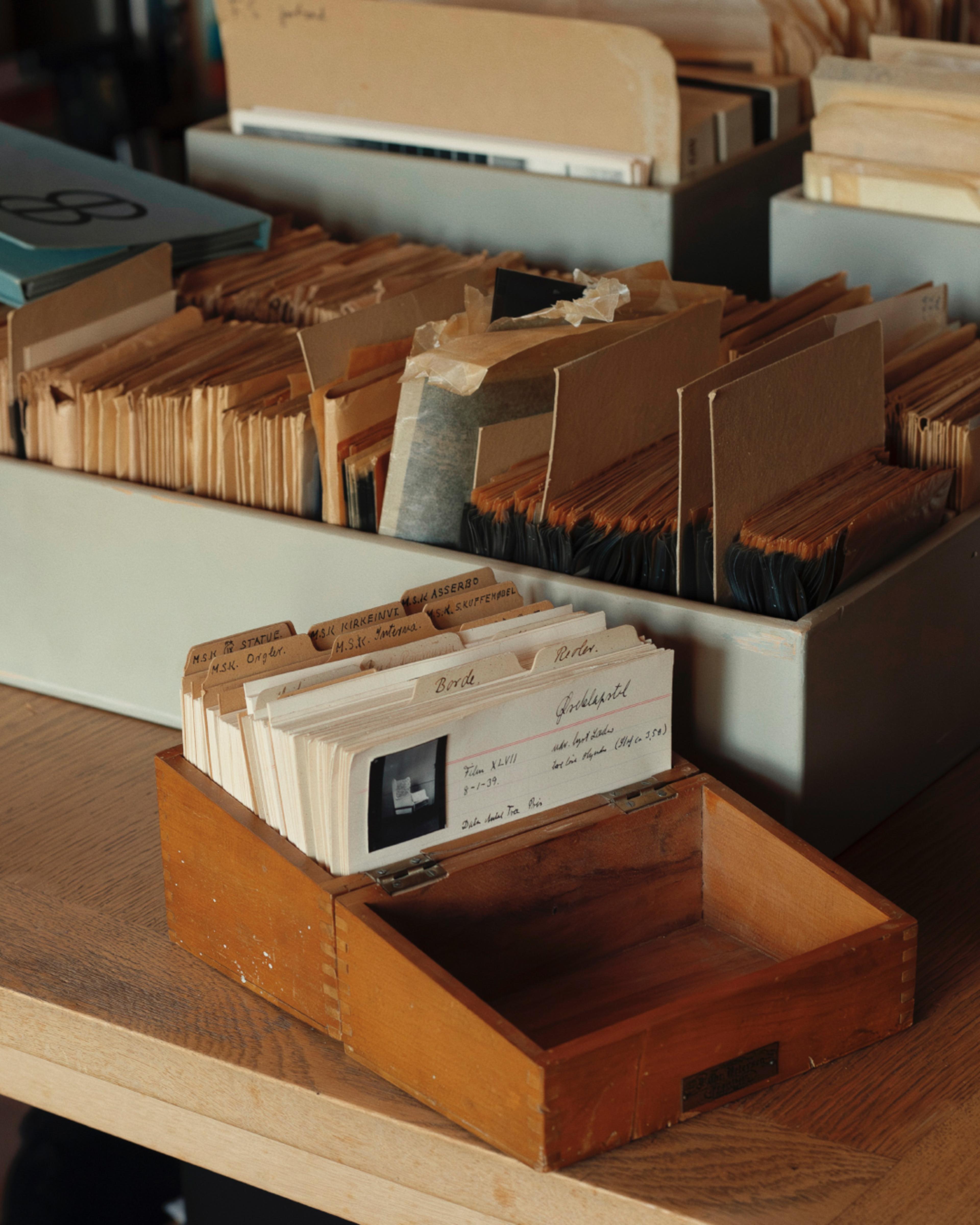 Original sketches, prototypes, and furniture from Mogens Koch's original studio are all cherished in the hands of his son. Even the original box of index cards containing Mogens Koch's furniture designs is meticulously organised by category. Each card bears handwritten product details, accompanied by a small sketch of the design - drawn by Mogens Koch himself, showcasing his precise and structured approach.