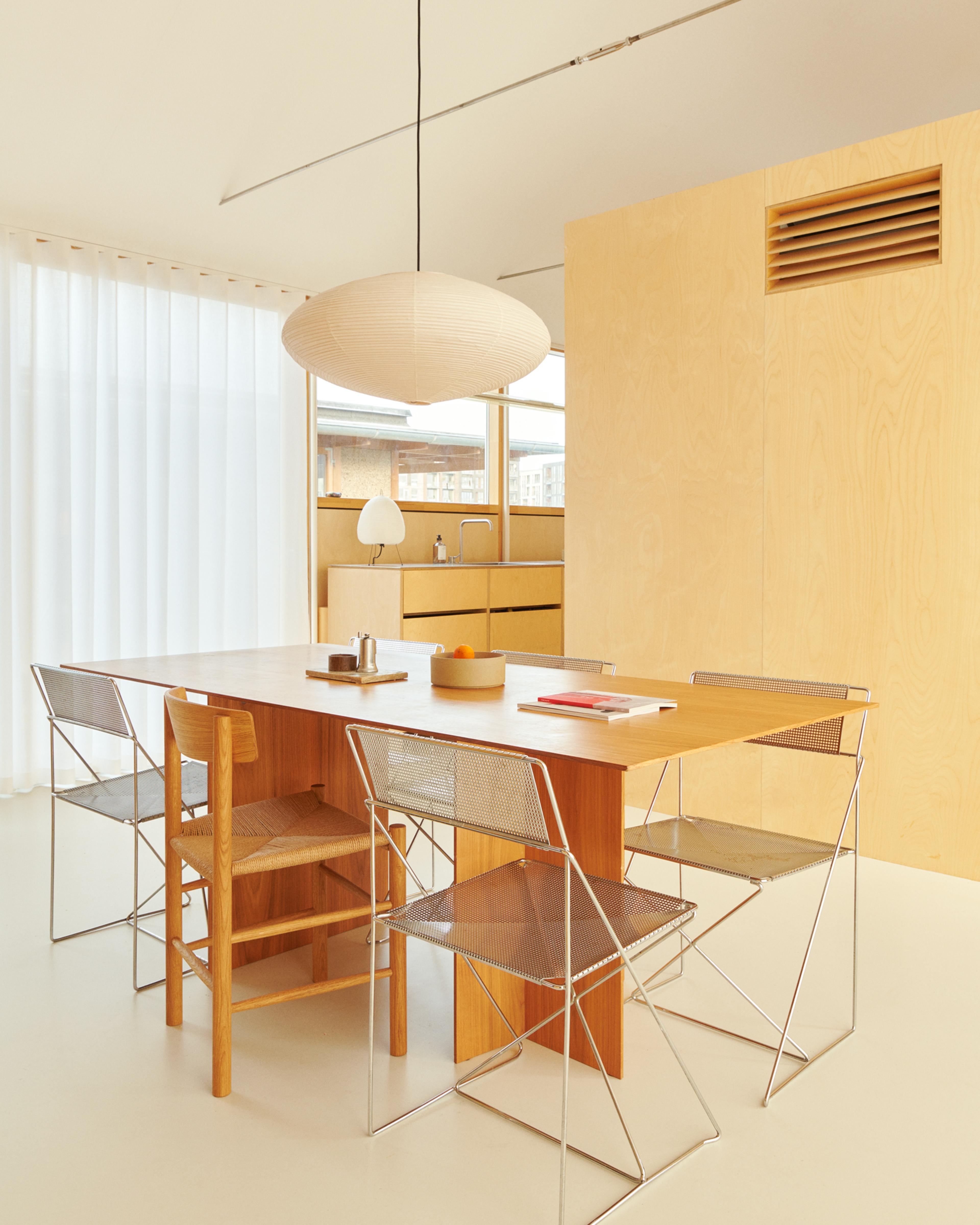 Together, Eva and Nikola have designed the unique 100-square-meter houseboat, drawing inspiration from Canadian boathouses with its aluminium corrugated panels on both the roof and facade. The lightweight white curtains, elegantly mimicking the outdoor aluminium panels, provide a tactile and poetic expression to the residence. The couple's shared passion for modern Japanese minimalism is reflected in the furnishings, designed from simple materials consisting of birch veneer, stainless steel details, and built-in solutions.