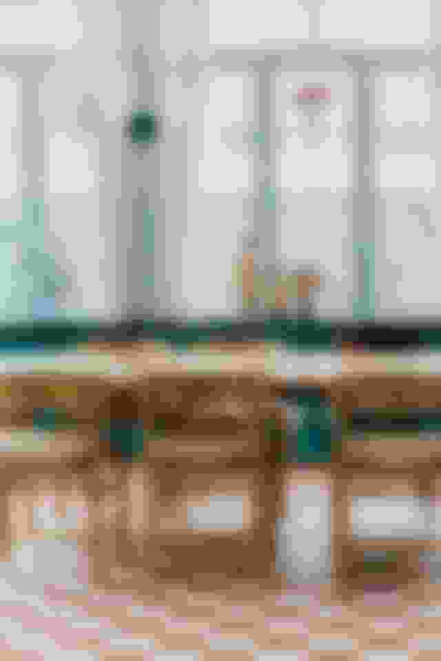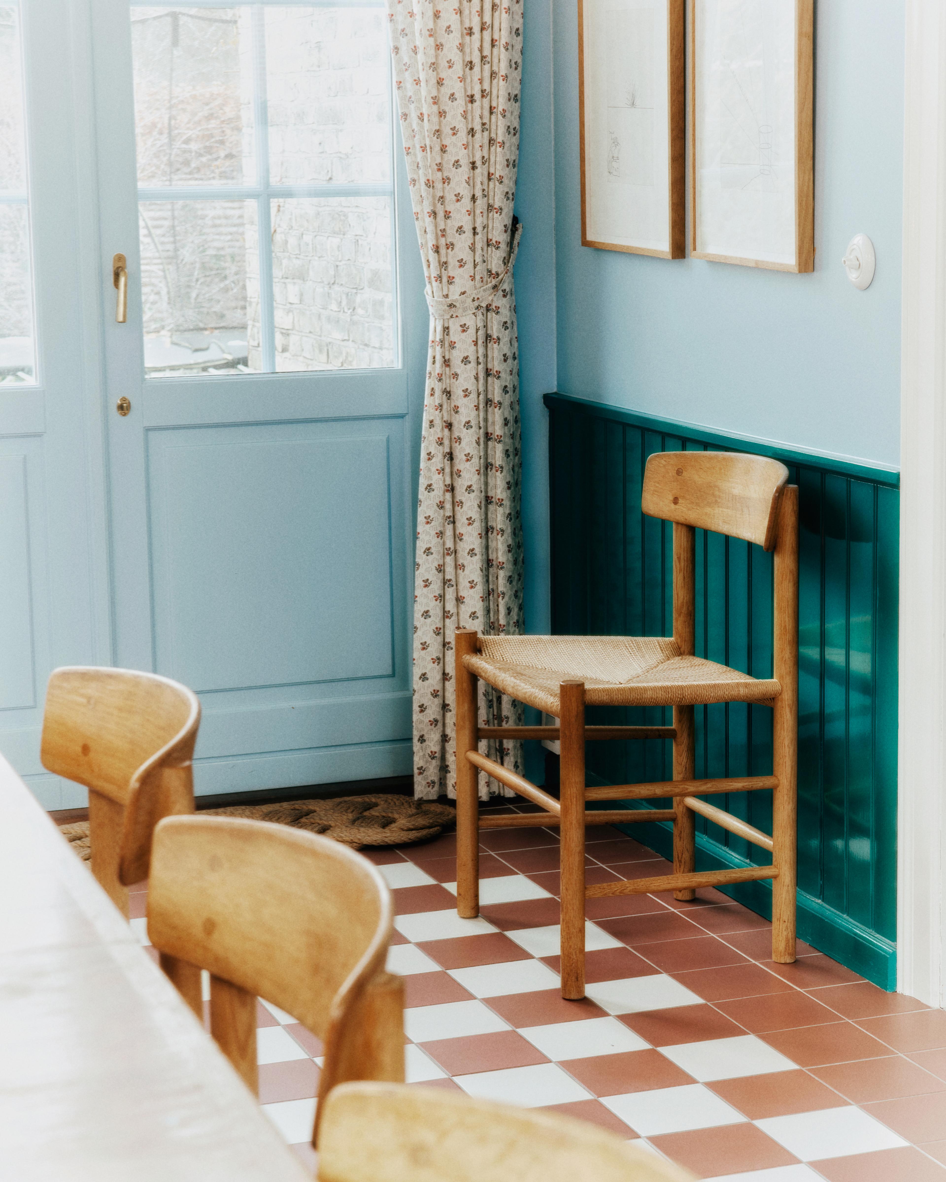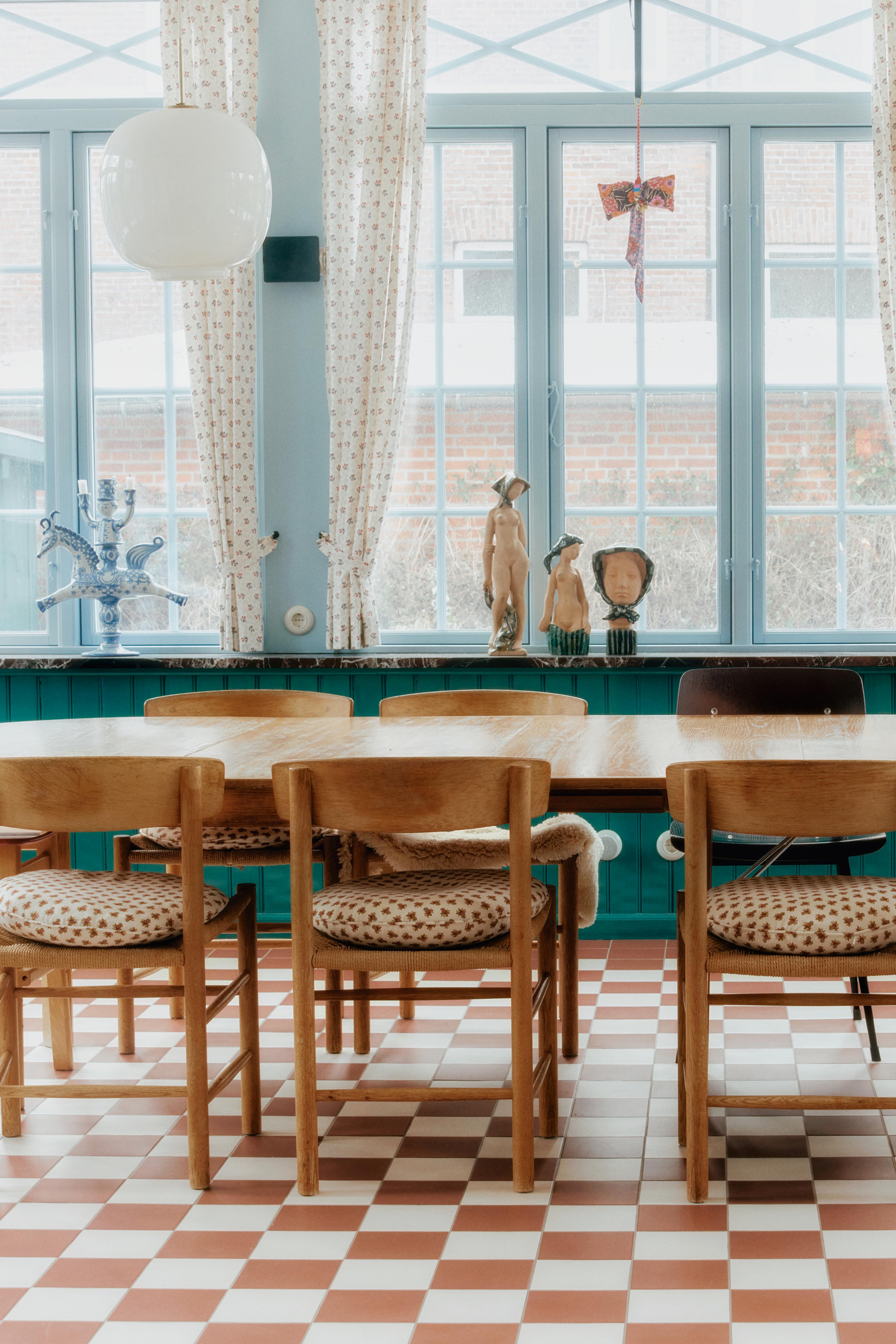 In the dining room, with its beautiful checkered floor, stands an old mid-century table designed by Børge Mogensen. The table is also surrounded by Mogensen's iconic J39 chairs, adding a touch of Danish design history to the space.