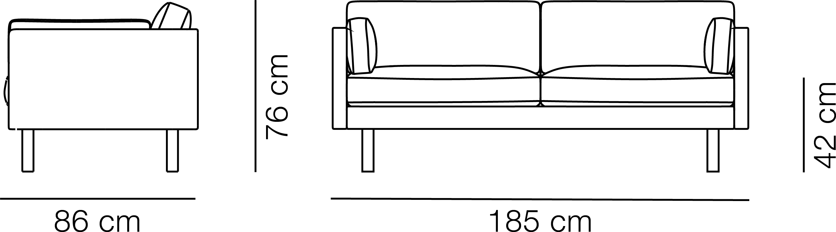 Sofa with separate arm, seat and back cushions, width 86 cm. Inner frame of wood with nozag springs. Available in fabric or leather. Cushions available in foam core, either HR or CMHR foam with down wrap. Cushions in fabric are reversible. External cover available as non-removable (standard) or removable. Cushion covers are removable. Legs in solid wood or steel.