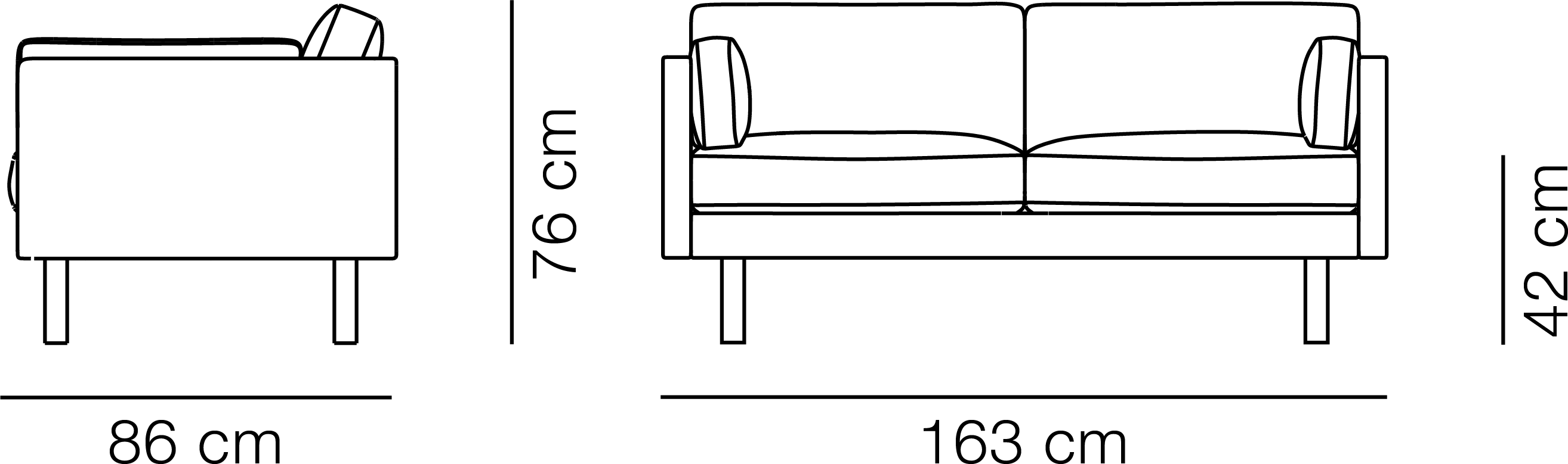 Sofa with separate arm, seat and back cushions, width 76 cm. Inner frame of wood with nozag springs. Available in fabric or leather. Cushions available in foam core, either HR or CMHR foam with down wrap. Cushions in fabric are reversible. External cover available as non-removable. Cushion covers are removable. Legs in solid wood or steel.