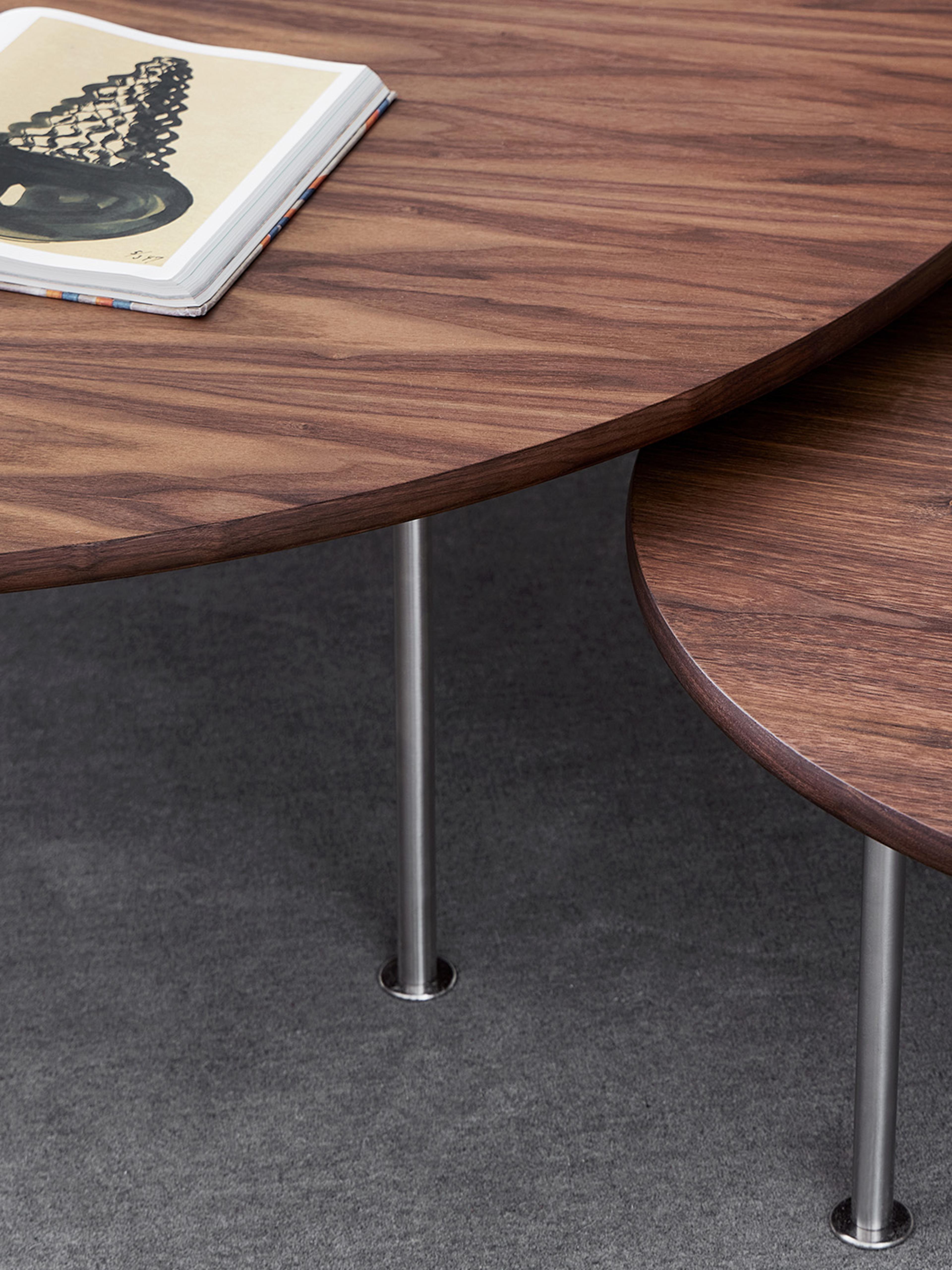 Designed in 1960, along with Ox Chair and Queen Chair, the Ox Table fits as a natural centrepiece. A classic Hans. J. Wegner piece of furniture in a simple, yet complex design with a self-supporting construction completed without any side rails resulting in a sleek and elegant profile. The table is available in two heights, and more tables can put together with overlapping table tops.